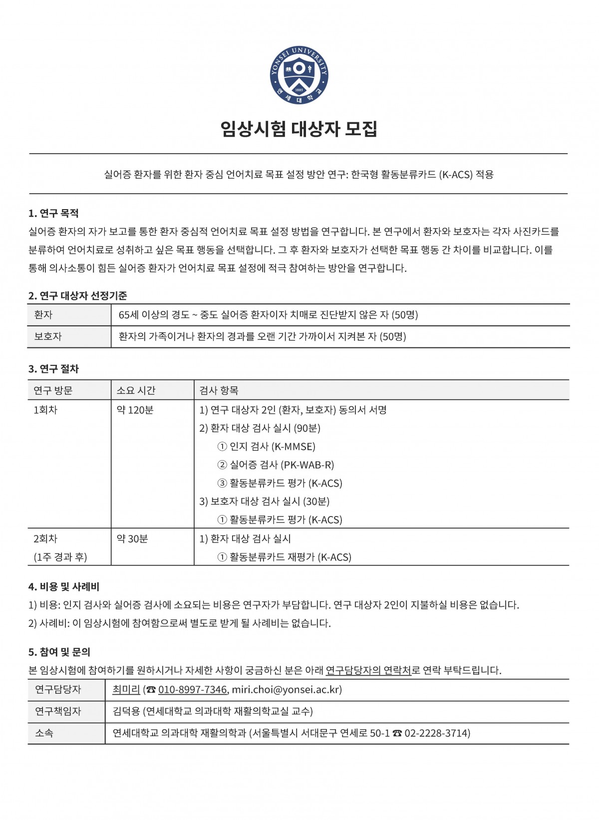 연세대학교 언어병리학과와 의과대학 재활의학과에서 진행하는 실어증 연구 대상자를 모집합니다.